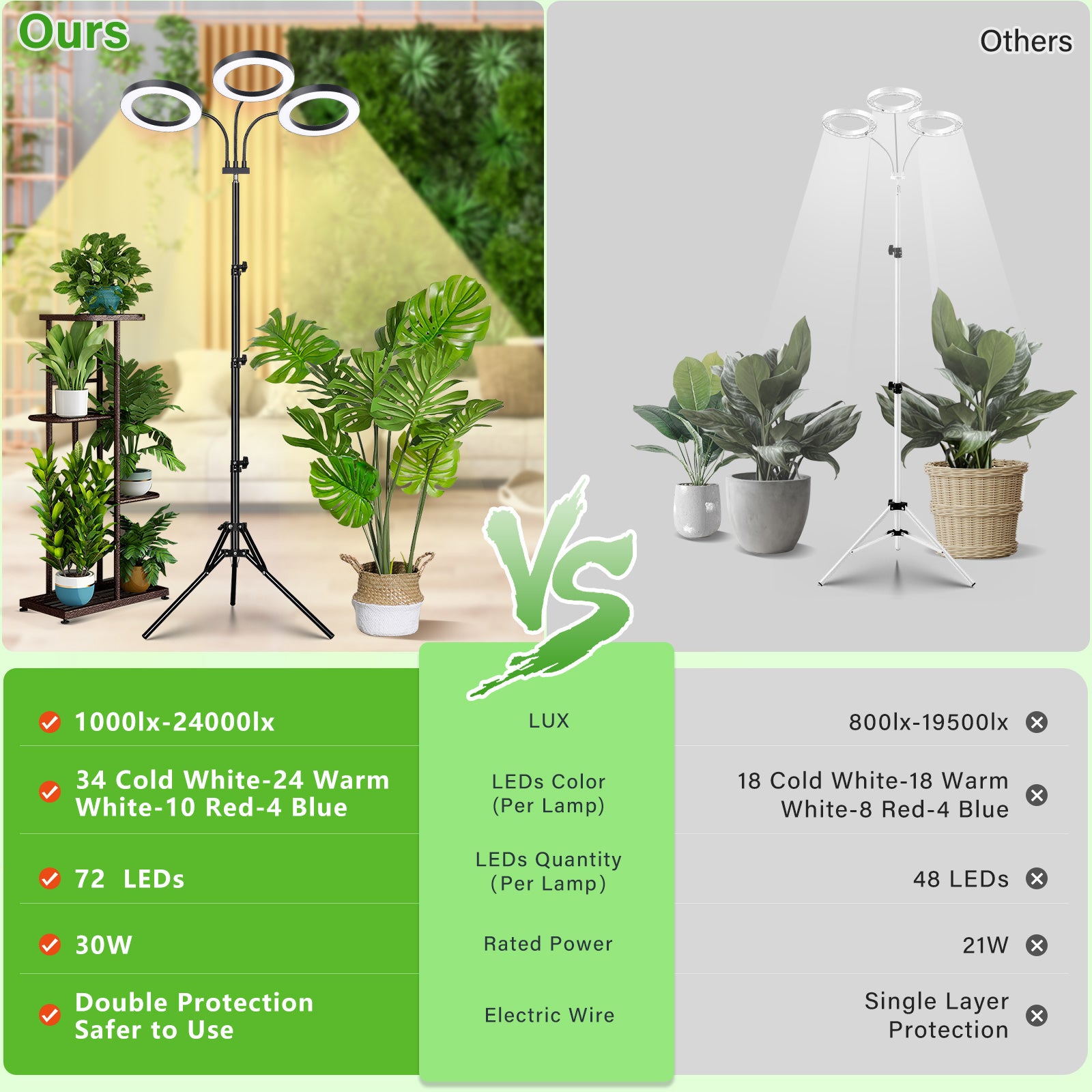 With three adjustable lamps, our plant grow light can provide a larger coverage area for your beloved plants. It is perfect for various indoor plants, especially tall plants including banana leaf trees, monstera, and olive trees. With a stable tripod stand and 360° gooseneck, the grow lamp is more convenient for different plants to adjust to suitable positions and heights, without wasting valuable space.