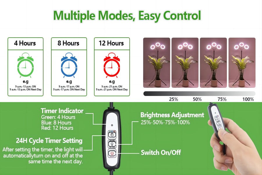 This light features a cycle timing function for 4H/8H/12H, allowing you to set it to turn on or off automatically. It also offers 25%-50%-75%-100% brightness to suit your plants' varying growth stages.