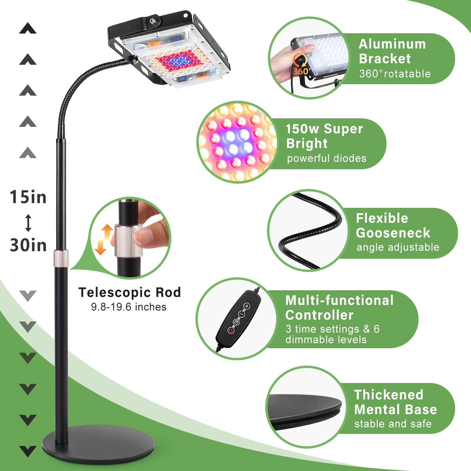 Adjustable Telescopic RodFeel free to adjust the height for your plants. The metal telescopic rod can be easily extended from 9.5-15.4 inches. It can be stabilized at any height, offers sufficient lighting for plants at different growth stages.