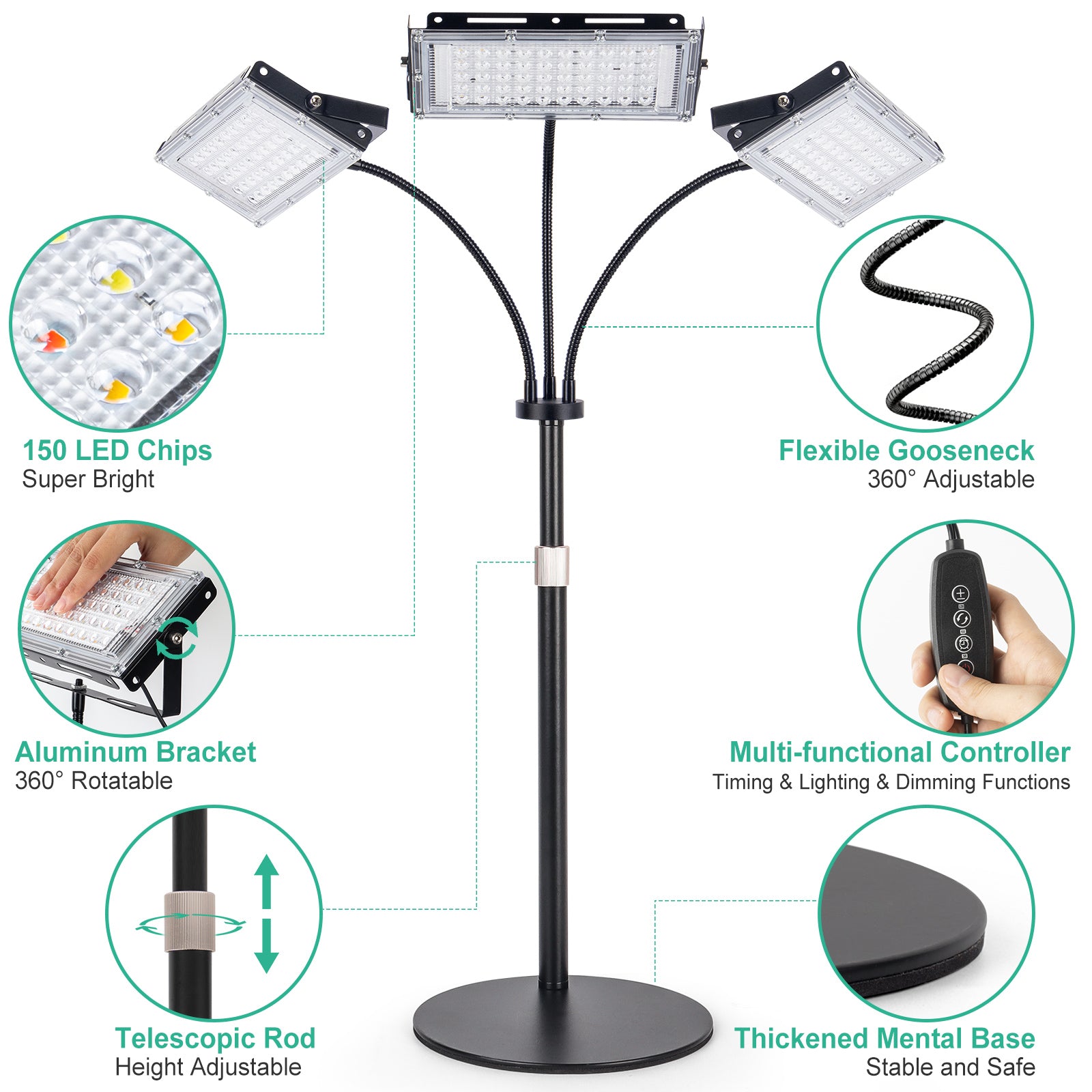 High EfficiencyThe tri-head lamp equipped with 150 powerful LEDs, emits the perfect wavelength from 380nm-800nm, suitable for plants of different growth stage. The upgraded design gives wider and brighter illumination area, achieving 360° coverage of plants.