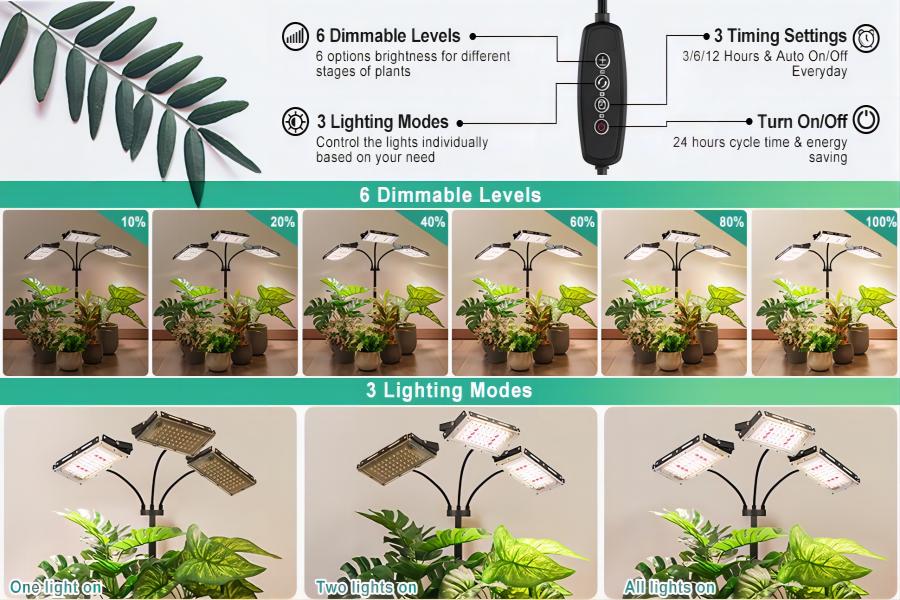 3 Lighting Modes & 6 Brightness Levels: This LED grow light has 3 switch modes, each light can be controlled individually, you can turn one light on, two lights on, or all lights on. And it also has 6 brightness levels, suitable for every cycle of plant growth.