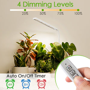 Convenient ControllerThis grow light is equipped with 4 brightness settings (25%, 50%, 75%, 100%), allowing you to adjust the lighting intensity to suit your plant's growth requirements. It also can be set for 4, 8, or 12 hours, according to the plants' needs. It will automatically turn on and off at the same time the next day if you do not manually turn off the light or cut off the power supply.