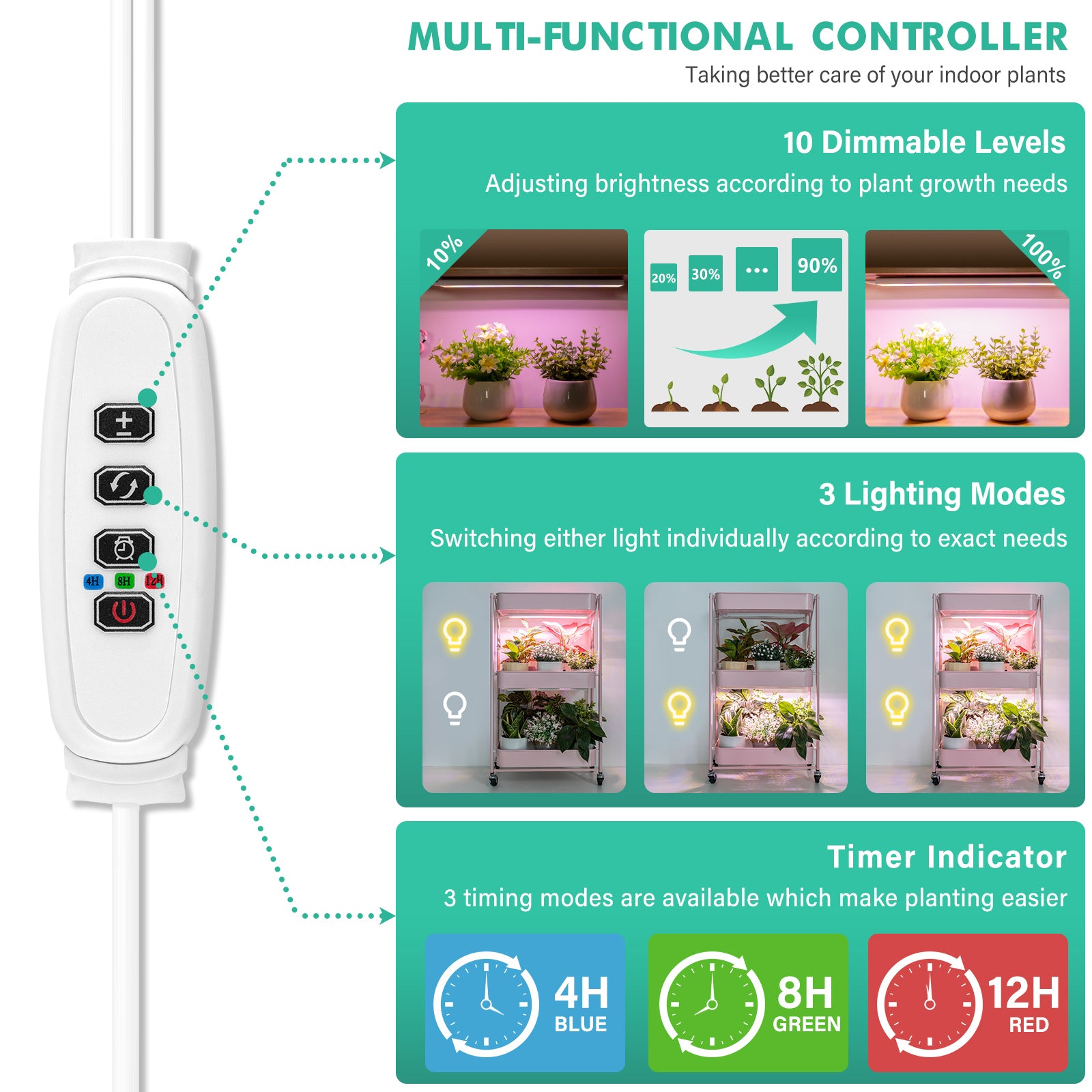 Equipped with many new technology diodes (192 LED), our grow light is very bright and efficient. The plant lights have 3 switch modes, you can turn one light on, the other light on, or both on. It also has 10 levels of dimming. Give your plants better care by giving them the proper light intensity they desire!