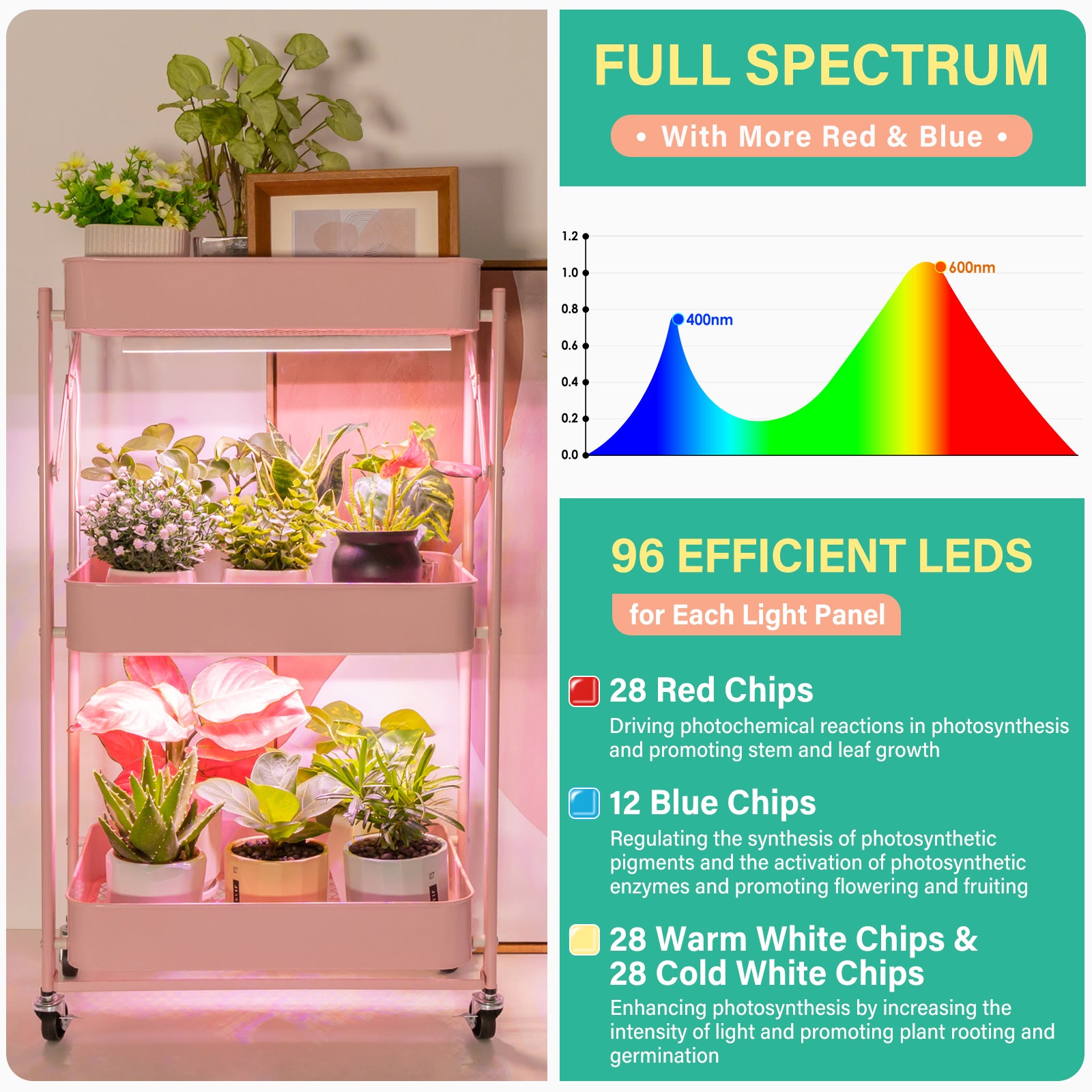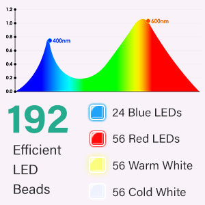 Boost your indoor gardening with our grow light strip that features 192 highly efficient LED chips, including 56 cold white, 56 warm white, 56 red, and 24 blue lights. The full spectrum, along with the optimal red and blue spectrum, stimulates plant growth effectively and promotes photosynthesis. Witness faster and healthier plant growth with our grow light strip.