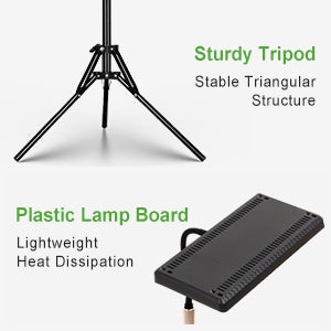 Designed with a plastic outer shell and an aluminum light panel, our plant lamp is lightweight and sturdy. It comes with a 1.5m tripod, allowing you to adjust the height between 27.8-74.8in. And it also has a sling that allows you to use the light in a hanging manner. Our grow light will achieve optimal lighting conditions for your plants at any growth stage.