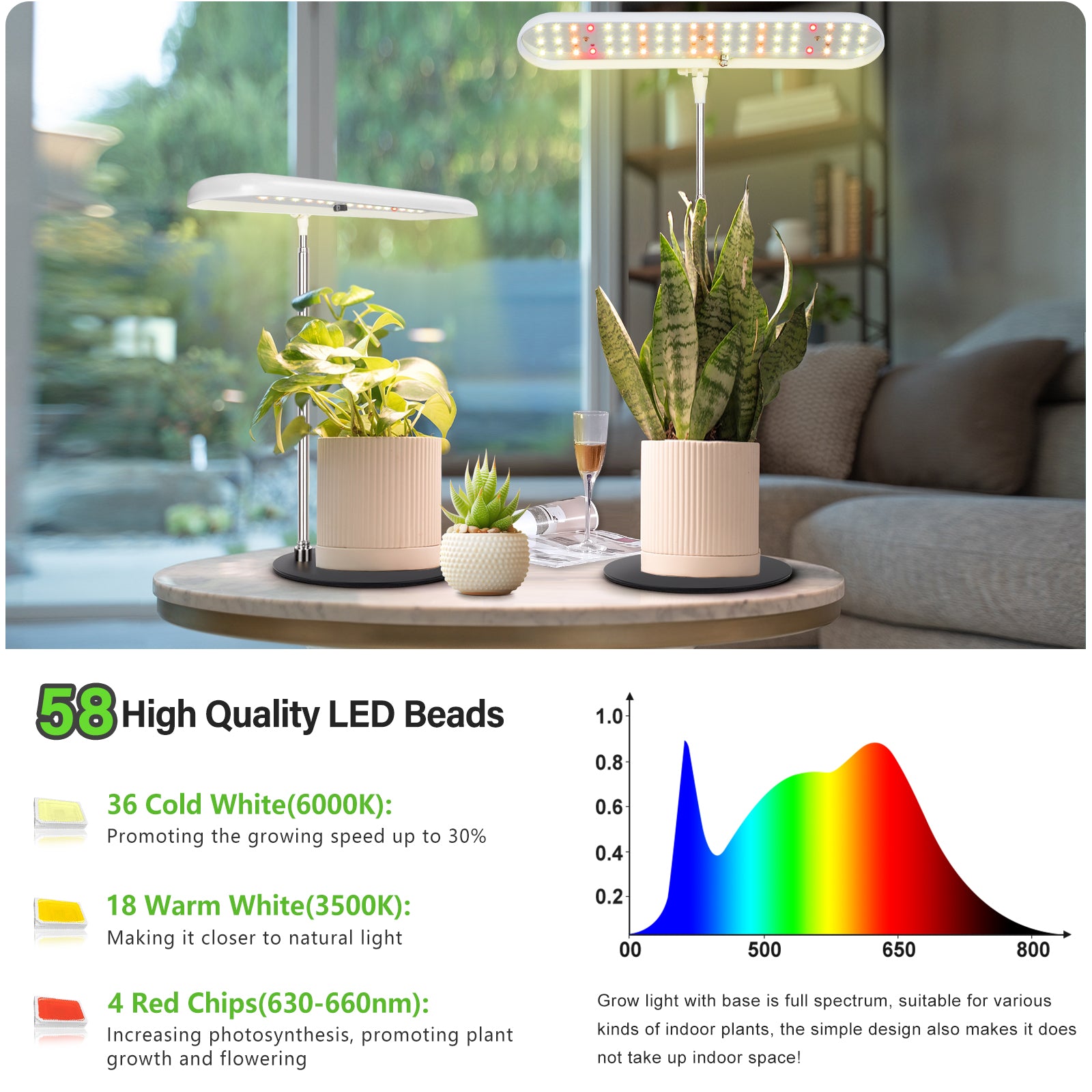 Our plant light covers the full spectrum range required for plant growth. This full-spectrum lighting technology promotes photosynthesis, germination of seedlings, growth, and flowering, ensuring the health and vitality of your plants. 58 long life span beads utilize energy-efficient LED technology offering higher energy efficiency, which not only promotes environmental sustainability but also helps you save on energy costs.