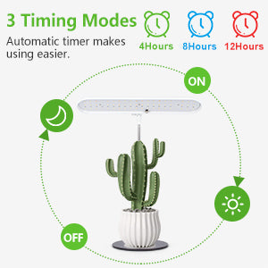 Our up-graded plant light features a built-in automatic cycle timer, allowing you to choose 4H/ 8H/ 12H of lighting duration. Once set, the plant light will automatically turn off after the designated time and illuminate again the next day.