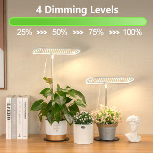 This plant grow light is equipped with a built-in timer, so you can effortlessly schedule your plant's lighting cycle. Choose from three preset options of 4/ 8/ 12 hours to suit your plant's specific needs. Dimming function with four adjustable levels (25%, 50%, 75%, and 100%) for customized lighting intensity. Effortlessly create the ideal lighting environment for your plant's growth and development.